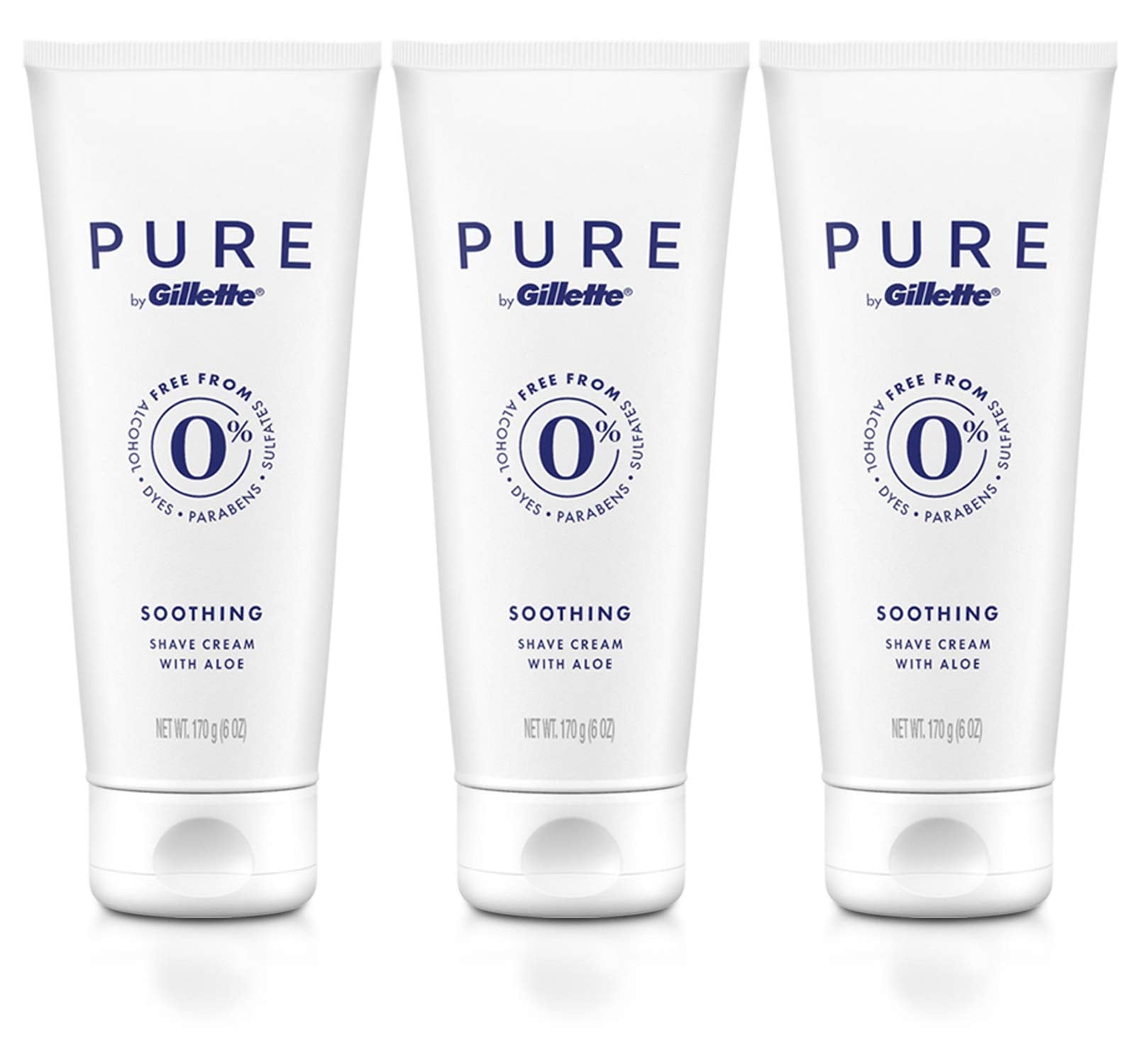 Details: PURE by Gillette is 0% alcohol, dyes, parabens, and sulfates. PURE shave cream is infused with aloe and helps your razor glide smoothly over your skin. Our specially designed formula will help protect against irritation on sensitive skin during the shave and lightly cool to soothe. Experience dramatically soft skin with every shave.