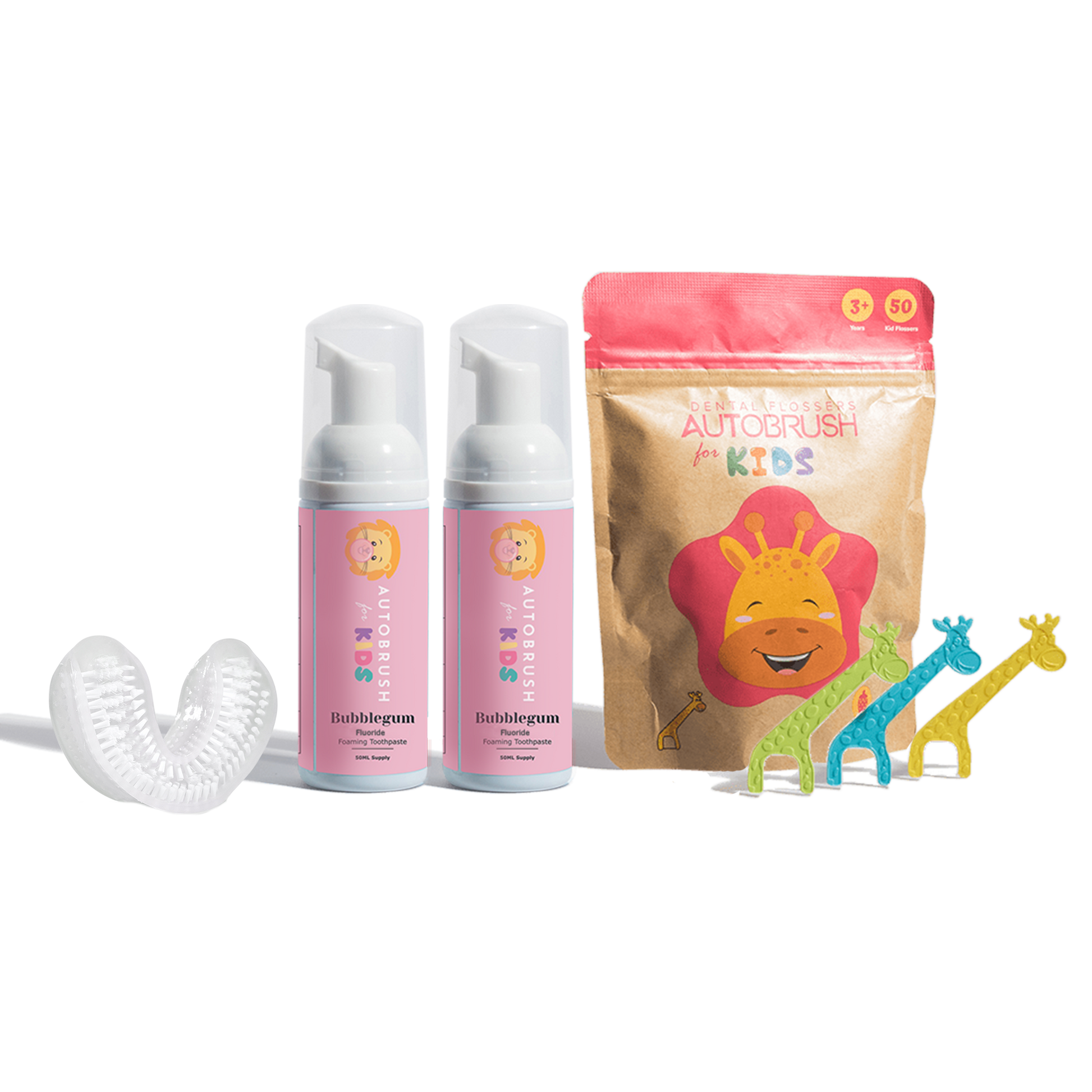 Optimize your oral care with our autobrush® Replenishment Pack. It includes 2 foam toothpastes, 1 double-sided nylon brush head, and a 50ct pack of flossers. Available in adult or kid sizes and various foam toothpaste flavors (with fluoride or hydroxyapatite), these essentials are compatible with any autobrush base. Clinically proven to clean 27x better than traditional toothbrushes, it's your all-in-one oral hygiene solution.